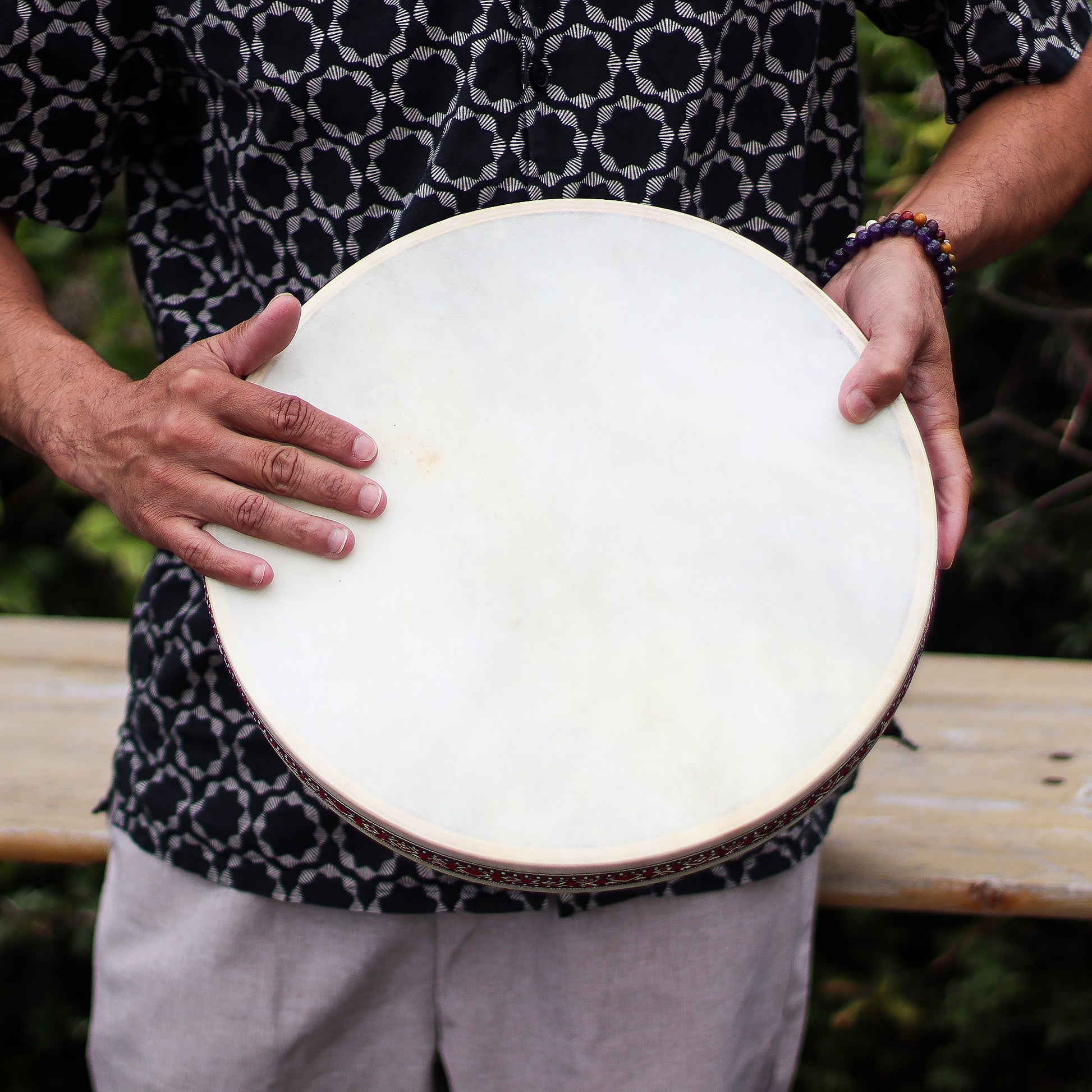 Immerse yourself in the soothing rhythm of the sea with the Shaman Sound Healing Ocean Drum, beautifully handcrafted in Indonesia. Made with natural goatskin and a patterned Gamal wood frame, this versatile drum recreates the tranquil wash of ocean waves when tilted or gently shaken.